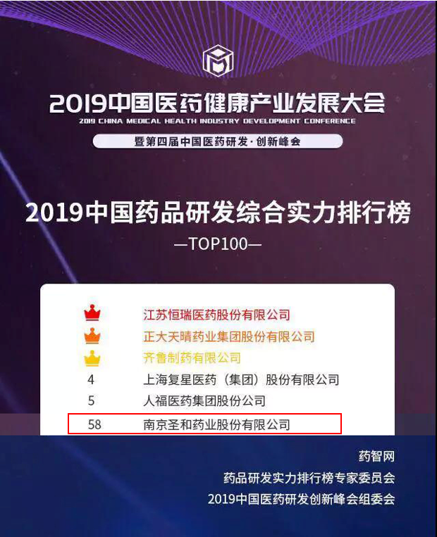 2019年6月21日,“2019中國(guó)醫(yī)藥健康產(chǎn)業(yè)發(fā)展大會(huì)暨第四屆中國(guó)醫(yī)藥研發(fā)?創(chuàng)新峰會(huì)”(PDI大會(huì))于重慶國(guó)際會(huì)議展覽中心(南坪)耀世啟幕。大會(huì)隆重揭曉了《2019中國(guó)藥品研發(fā)實(shí)力排行榜》系列榜單,其中最受矚目的《2019中國(guó)藥品研發(fā)綜合實(shí)力排行榜 TOP100》和《2019中國(guó)化藥研發(fā)實(shí)力排行榜 TOP100》各有百家創(chuàng)新型企業(yè)代表入圍,圣和藥業(yè)同時(shí)入圍這兩個(gè)榜單,分別位列第58名和第24名。