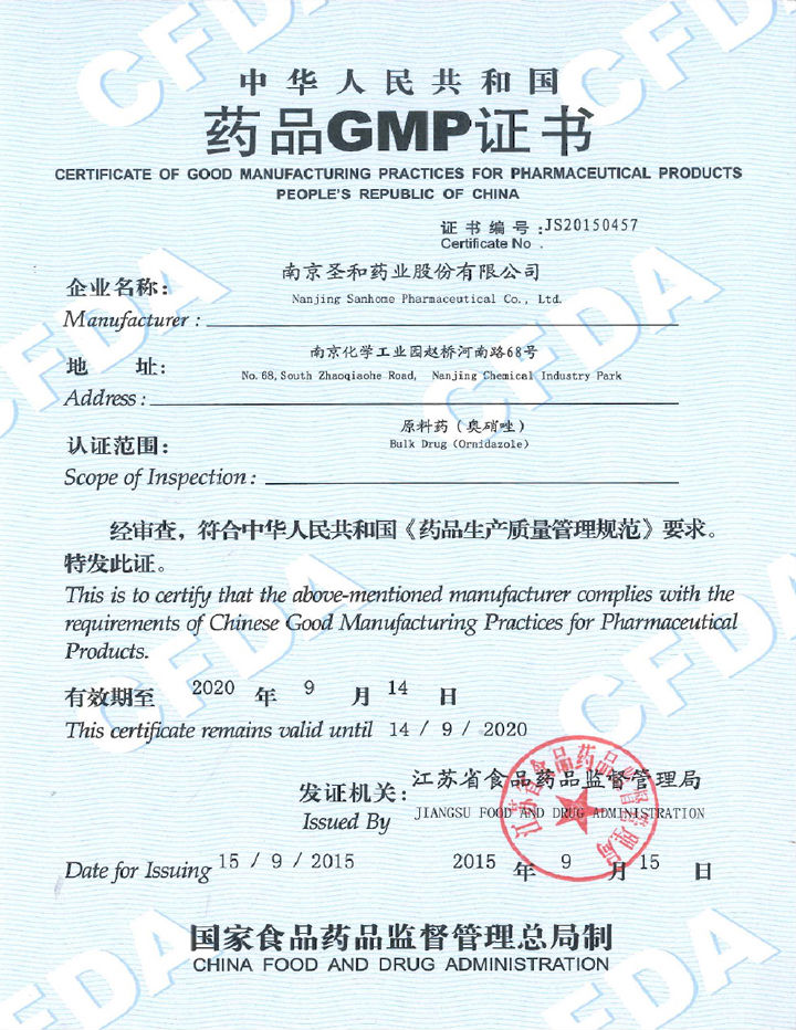 In September 2015, API (ornidazole) GMP certification, certificate number: JS20150457
