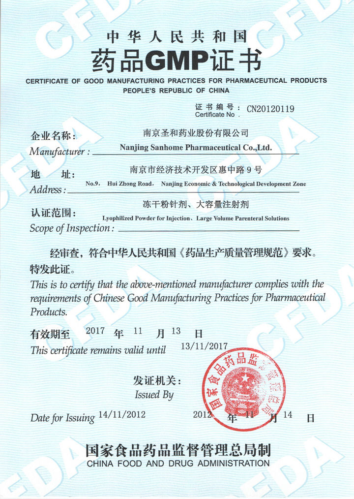In November 2012, freeze-dried powder injection, small-volume injection GMP certification, certificate number: CN20120119