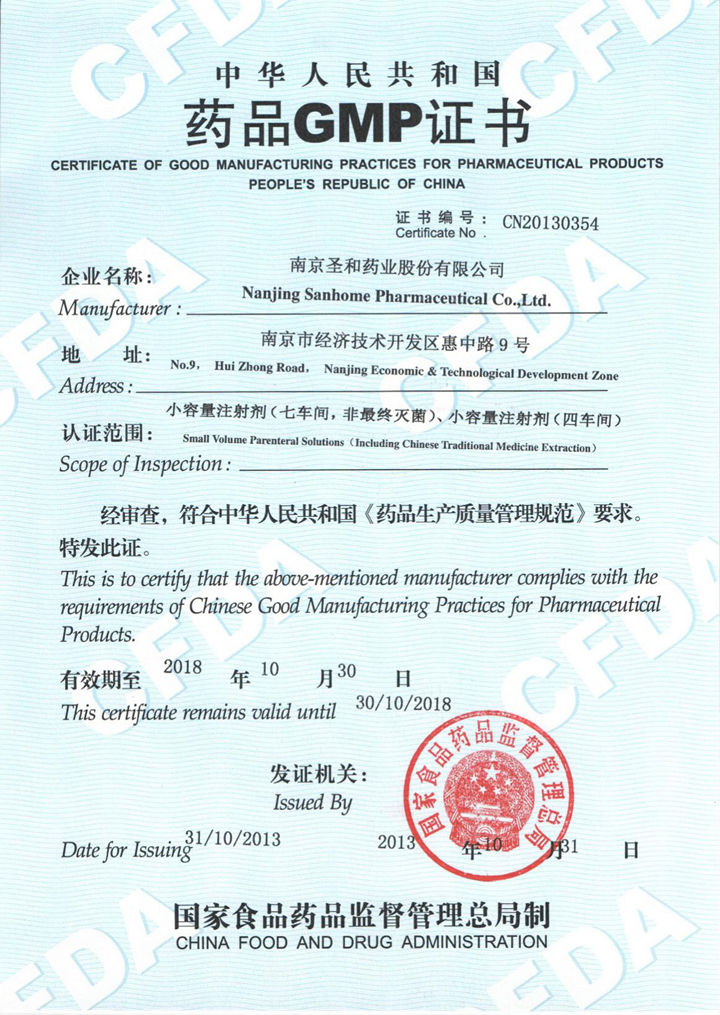 In October 2013, small-volume injection (the seventh workshop, not terminally sterilized), small-volume injection (the fourth workshop) GMP certification, certificate number: CN20130354
